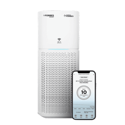 FORBES AIR PURIFIER 500 SMART with Surround 360° Air Intake Technology and Integrated True HEPA Grade 13 filter to provide purified air that ensures a healthier environment. Ideal for Entire Home up to 670 sq. feet. Air Purifier can be operated through smart phone application. Purifies Air in 10 mins** with a tap on your smart app.