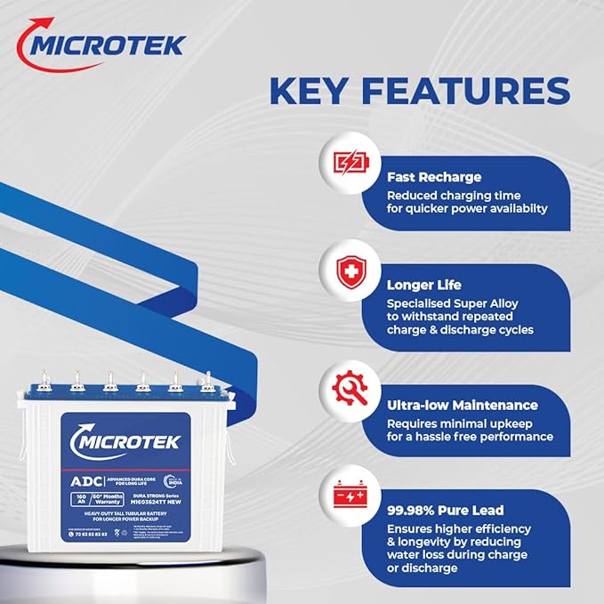 - All-in-One Power Backup Solution – Includes Microtek SUPER POWER UPS 700 (600VA) Pure Digital Wave Inverter with a robust M1603624TT 150Ah/12V Tall Tubular Battery for high-efficiency backup.