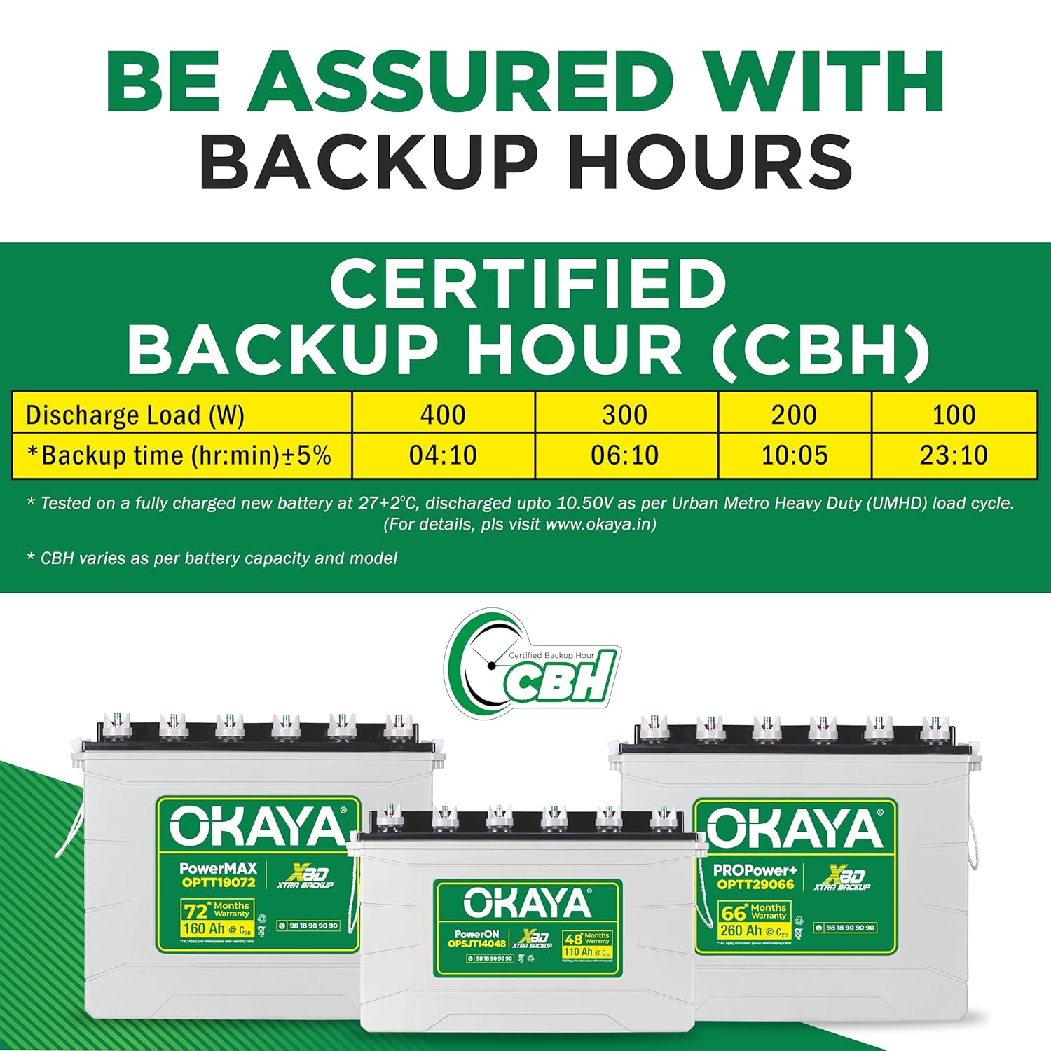 - All new Super Jumbo Tubular Battery, the next generation of Jumbo Tubular Battery, build to withstand the toughest conditions. The Xtra Backup Design (XBD) remains intact ensuring 15-20% longer backup time. Certified Backup Hour (CBH) – World’s first to declare actual backup time at different power loads, certified by NABL accredited Lab